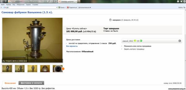 Александр , во первых поздравляю с покупкой " ракеты " ! Во вторых , с радостью отвечу на вопросы по самовару фабрики Ваныкина 1,5 л . 1. Такого самовара у меня нет . 2. Как только такой подвернется , не раздумывая куплю ! 3. По цене , я не лучший советчик . Мое мнение : любая вещь стоит столько , сколько за нее платят . Кому то этот самовар не нужен и за 20 000 р , А кто то за него заплатит любую сумму , лишь бы он оказался в его коллекции . Но я считаю , что Ваша цена несколько завышена . 4. Если мне мои "поставщики " самоваров , такой принесут, я его куплю , что нибудь в районе 8 -10 тыс .р А вообще , конечно это мое субъективное мнение , цена на такой самовар должна начинаться от 120 000 р, ну а дальше , как карта ляжет 5. Как таковой красоты , в самоваре абсолютно нет ! Любая рюмка гранями , да еще если и с "косичками " намного красивее ! Но этот самовар , просто КЛАСС ! Мое мнение , что такой самовар может быть украшением любой коллекции !!! Его прелесть именно в его простоте ! Пузатых самоваров очень много , а вот такие встречаются очень редко , да еще в такой комплектации и такого авторитетного производителя. Лично я , обожаю такие узкие безподдувальные ! 6. В продаже я его не видел . Мое мнение : Это очень интересный коллекционный самовар , который ни в коем случае продавать нельзя ! Кстати , Александр , выскажите свое мнение , по поводу моего "произведения " в теме "Без названия " Если , что то не понравилось , можете прямо об этом написать , Вы меня этим не обидите . Мне это нужно для того , чтобы сделать соответствующие выводы и дальше работать над своим слогом !