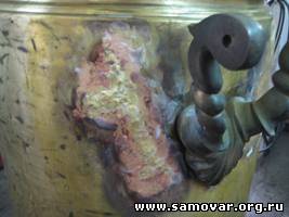 Лучше конечно припоями.Латунь по температуре плавления одинакова с туловом самовара.есть вероятность прожечь самовар. |