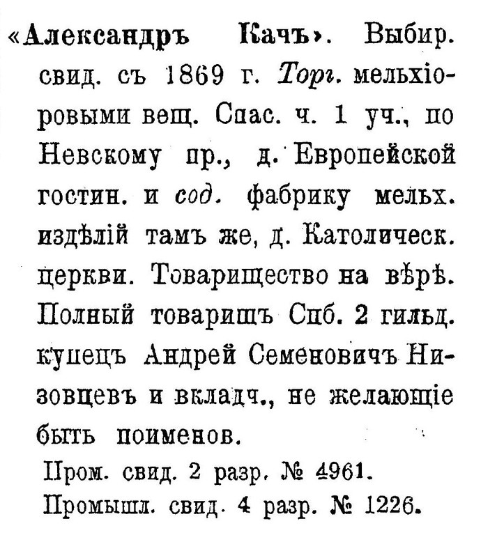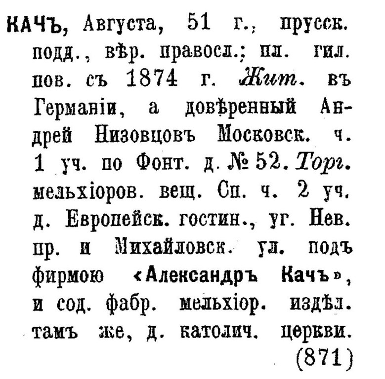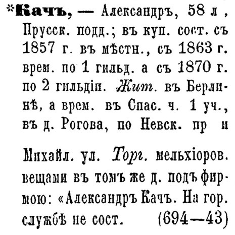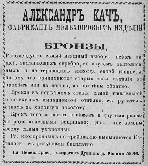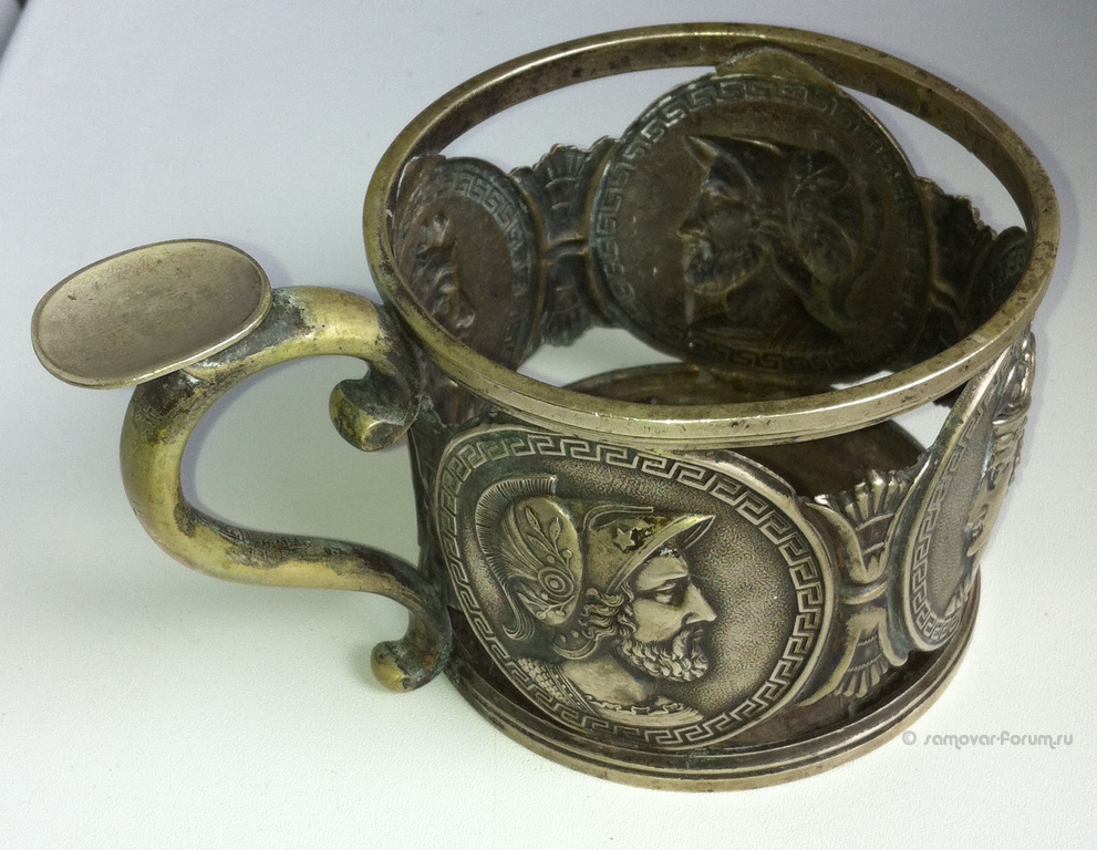 | Группа: Пользователи Сообщений: 1 Статус: Offline | Подстаканник Легионеры 1861-72г., клеймо фирмы «Александр Качъ», фабрики мельхиоровых изделий и бронзы. "Фабрика мельхiоровыхъ издълiй и бронзы АЛЕКС. КАЧЪ ВЪ С.-Петербургъ на Невскомъ проспектъ, против Думы, в домъ Европейской Гостинницы, № 36". Прошу консультации в оценке стоимости предмета искусства.