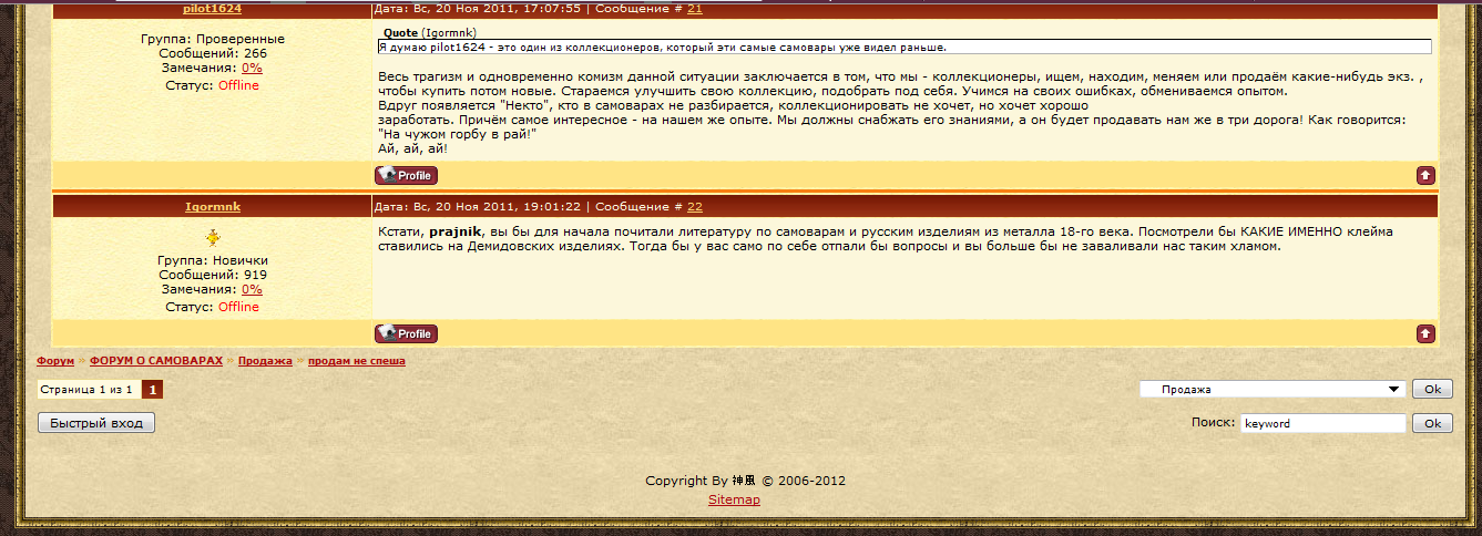 Я правильно понимаю, что это "Форум о самоварах"!? Есть раздел "Продаю", есть раздел "Покупаю", есть раздел, где люди задают вопросы о самоварах?! Или я как-то что-то путаю?... Если человек продает самовары, которые ему не интересны и покупает то, что является темой его коллекции - это не правильно???? С уважением ко всем! Олег Викторович...