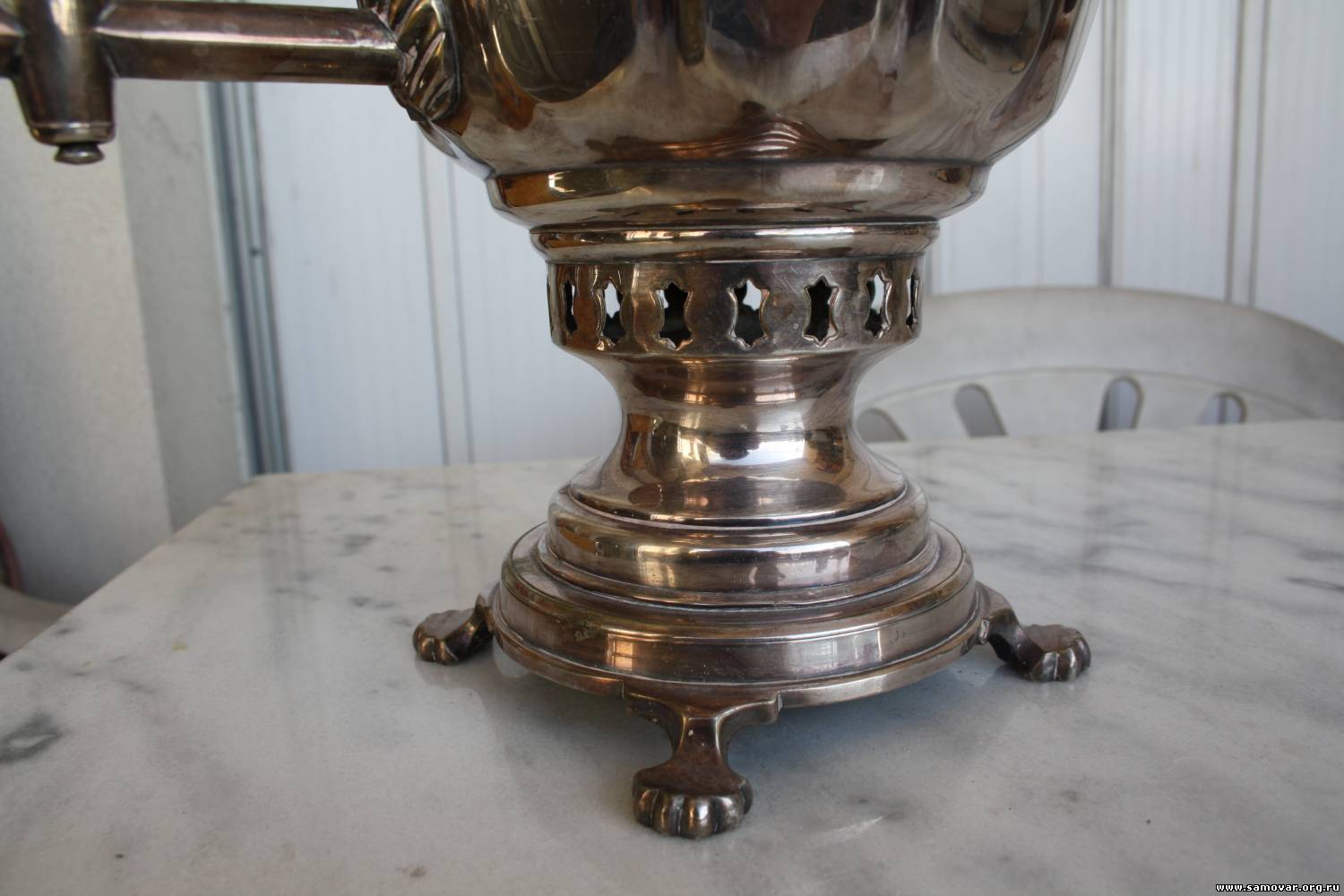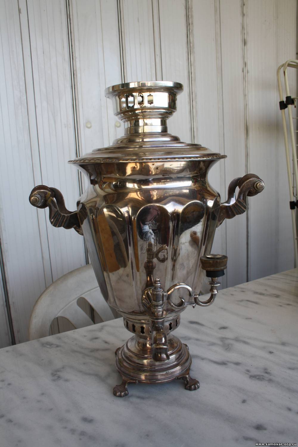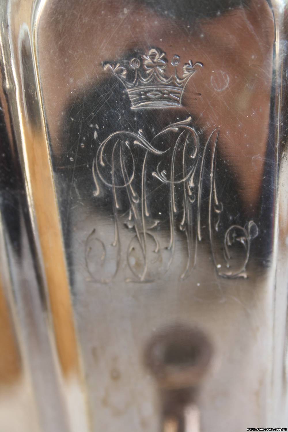 Представляю своего Капырзина.Самовар стандартный,но есть вопросы.Он посеребрённый.Когда? На фабрике Капырзина ,или потом, во Франции, где и куплен. На тулове вензель N. M. с короной над вензелем, говорит о том, что самовар принадлежал (подарен) дворянской фамилии. Подобный тип короны - золотой обруч с тремя листовидными зубцами, между которыми три малых зубца с жемчужинами - наиболее распространенный тип в России (а также в Германии,Швеции,Дании,Голландии), но не во Франции,где и чай то,как правило, ,не употребляют. Капырзин с сыновьями. 2,5-2,7л,.3,2 кг., 42см.