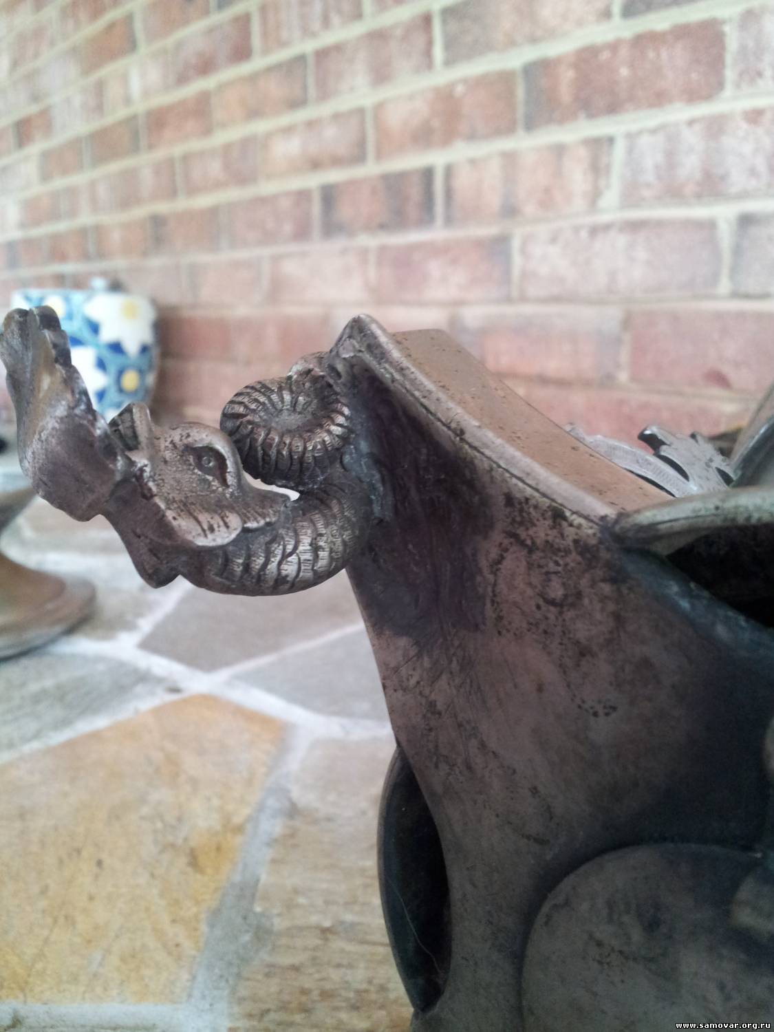Добрый день.Ножки-дельфины,выше-петух-союз воды и воздуха;еще на ветку крана какого-нибудь баранчика и было бы гармонично(ну хотя бы по идее)-союз земли,воды и воздуха.Может такая была задумка.Врать не буду,больше всего не нравится в данном ансамбле шейка,как будто подстаканник впаяли.Не зря дед убрал его с глаз,что-то в нем не так,всего много,но все живет своей жизнью. ИГОРb,прав он сделан на заказ и он такой один,а следовательно имеет право на существование.