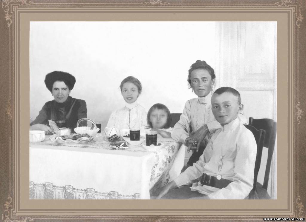 natan, как я понимаю, правильный ответ Вы сами НЕ знаете. Семья священника была не малой (по крайней мере 6 человек, священника на фото нет), ПРЕДПОЛЖУ, что священник заказал местному Умельцу на обычный самовар добавить ЕЩЕ 2 крана Если это верно, то "высосать" из этого фото больше - НЕ представляется возможным